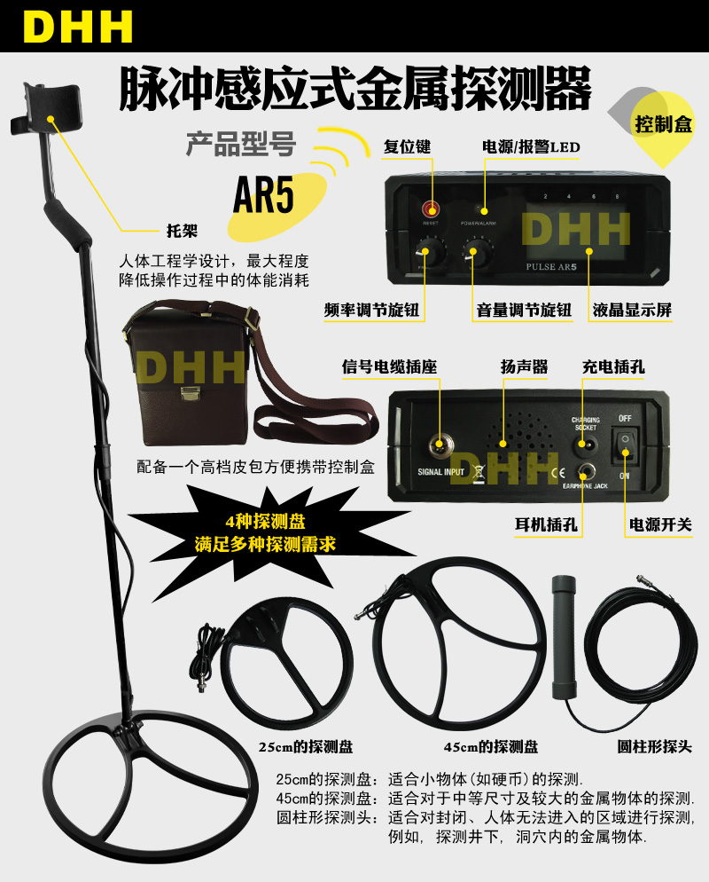 AR-5是德国最 新研发的金属定位探测仪器。是AR-III的升级版,常用于考古、金银物品查找、金属管綫定位等。它的搜索速度快,搜索完一个足球场只需1—3个小时。探 测时,先用矿化排除专用电圈工作。使仪器使用时不会受矿化反应和盐类物质的影响,并且能识别出不同的金属物的具体种类。该仪器配有2个防水的探盘,其电导 圈可以在水体里使用。该仪器具有探测深度深,定位准确的特点,使用简单,携带方便 。它是目前操作最简单、功能最全面的高精度设备之一。常用语金、银、铜等金属物品的查找,金属管线的定位、考古、水下探测等方面。具 有定位测量、深度测量、体积测量、种类识别等功能。主机采用塑金混合壳体,耐冲压,真皮包装,便于携带,面板结构坚固,声、光、电全功能体现。主机电路基 采用全数字化长寿命设计,内置计算机微处理系统,具有低功耗、运算速度高的优点。内置大功率可充电能、高传真扬声器、耳机插孔,充电输出一体化全金属插 件,LED指示灯、指针式电平能够非常直观呈现工作状态,蓝色LED指示灯在计算机微处理系统的帮助下,距离测量时误差仅为±2cm.本机还具有优良记忆 功能,能记忆工作环境中的状态,您可以根据记忆下来的数值,通过对比对目标物体进行精确的距测、体测和种类识别。使探测爱好者在短时间内获得更具价值的信 息,是专业探测爱好者的首选仪器!