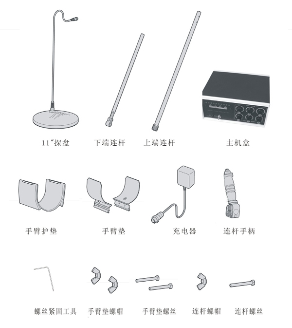 1、 取出探测器上端连杆、连杆手柄和手臂托五金片,用随