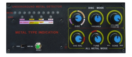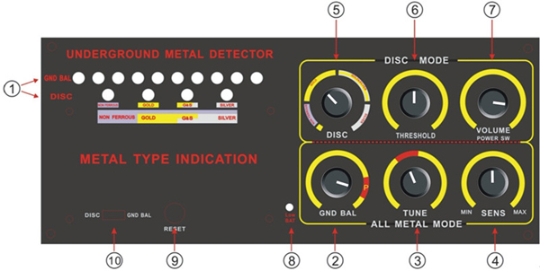 指示面板按照美国地下金属探测器指示标准而标示,第一排10个LED灯是全金属信号指示,第二排4个LED灯为金属类别指示。全金属模式时,当探测到金属时,面板上第一排LED灯会渐渐的亮起,信号越强,LED灯亮起的数量越多。但在识别模式下,LED灯指示出探测到的金属类别。面板上的金属排列是依据金属的传导性、导电性。金属传导性越好,亮度区域越大。即使是相同的金属,LED信号强度也将有所不同。信号强度还受金属的形状、大小、和埋藏深度影响。