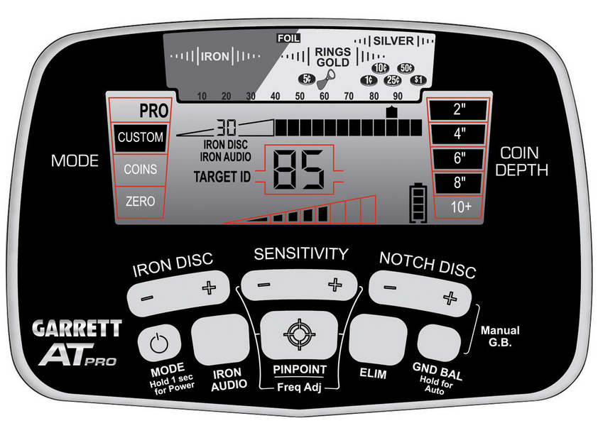 另外,数字目标区域可以提供更具体的数值。AT PRO对于铁金属的识别也具有很强的能力(最大值可调至40),因此您就可以探测您认为有价值的金属。先进的音频功能以及标准的28X22公分的椭圆双D探测盘使得该仪器在欧洲一些矿化土壤地区都可以达到最佳的性能。另外,AT PRO为有经验的探宝人提供了非常人性化的“标准模式”以及更加先进的“PRO专业探测模式”。