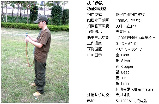 注意:您必须让扫描接收天线在您身体的左前方或右前方,让天线伸展开到合适的位 置,并在主机上选定您所需要探测的矿化金属分子物品种类,并且让天线较水平线略微向上倾斜,这个角度大概在91~95度之间。