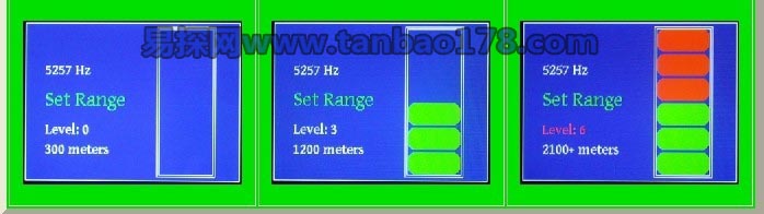为了获得最大的探测距离,应采用最高的范围级别。但是这样一来,探测到的小型物体会以更强的信号显示,电池的寿命也将减少到不到一个小时。默认范围3级,适用于多种小型和大型目标物体,同时保持无错误指示的稳定运行状态。