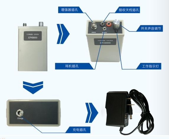 接收器:接收器在面板的上面是ON/OFF开关,下面有一个LED的指示灯,当接收器打开时,此指示灯变亮,指示灯的旁边有三个插孔,它们分别是耳机和天线棒插孔。不使用时,将天线棒从接收器上拔掉!若天线棒插在接收器里保存,则将导致电池漏电。接收器配有专业的充电器使用之前提前6个小时充电。