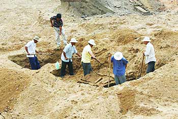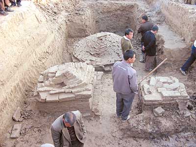 2 0日早晨,几名考古人员在西影路附近一处工地用金属探测仪探测时,发现了几块看上去有些年代的砖,随后向文物部门进行了报告,陕西省考古研究院的工作人员赶到后,发现这是一座未经盗窃的金代古墓,而其独特的形制,在西安地区比较罕见。