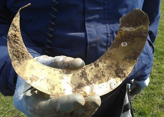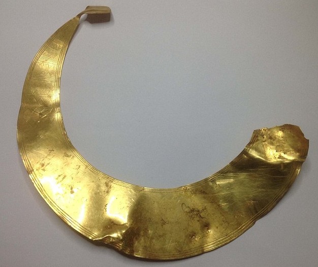 在英国多塞特塔兰特山谷的一片田地,业余寻宝猎人大卫-斯珀赫尔发现了一个价值2万英镑(约合3.3万美元)的古代部落黄金项圈,呈月牙形,年代可追溯到3500年前。