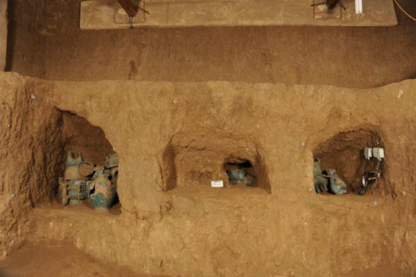 正在发掘的中型墓葬M4位于去年发掘的M3东南。已发现椁室上部的棚木、席纹等迹象。M4与M3的结构相似,形制稍大,在二层台之上约1米位置的东、北、西三侧的墓壁,有壁龛8座。截至26日,M4的一至八号壁龛已进行了二分之一方式的解剖性清理,发现青铜器共49件,有鼎、方鼎、簋、圆腹簋、壶、甗、罍、盘、簠、(犀)尊、铃等。陶器有鬲、罐各1件。另外,还有贝币、贝器、彩绘漆器等。同时,对已清理的遗迹、遗物进行了三维扫描、显微摄影、土壤的金属微量测试等相关信息的提取,及时实施了出土文物现场保护等的措施。