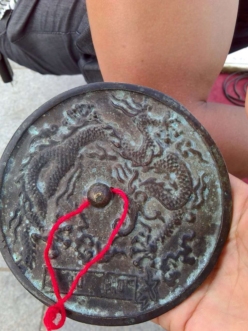 没过几天就在网上订购了台美洲豹地下金属探测器,几天之后探测器终于到手了,孙某高兴极了就想赶紧去满足自己的好奇心.意外的事第一次去探测就探测到铜镜一枚,一面平滑略有光泽,但大部已被铜绿所覆盖,中间有小孔可供细绳穿过的铜镜。