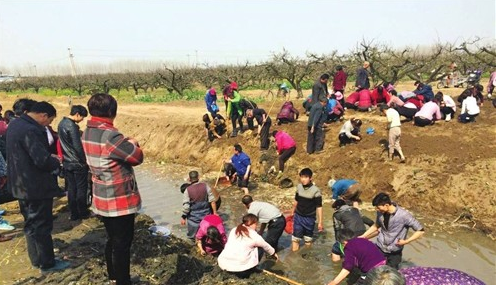 发现古钱币的地点位于盐都区龙冈镇一条小河沟两侧。昨天中午,在现场看到,路东侧的小河沟有6米左右宽,两侧都是用工具挖掘的村民,有的村民甚至卷起裤脚,拿上铲子、渔具、斗笠等工具,在河沟里“淘宝”,不时将找到的铜钱放进准备好的袋子里。据储巷村一些年纪较大的居民介绍,早在很久以前,出土铜钱的地方附近曾经有一座古庙,后来庙被毁了,估计这些古铜钱就是庙里留下来埋在沙土里的,“2007年时,几乎在同一个地方,也挖出来过一部分铜钱。”
