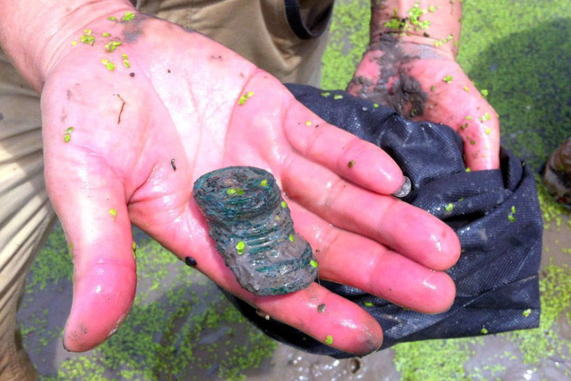 5月3日,江苏建湖一工地的水塘中挖出许多铜钱等古钱币,周围村民闻讯后,带着探宝工具纷纷前往水塘寻宝。图为村民们在池塘边的泥水中寻找古钱币。